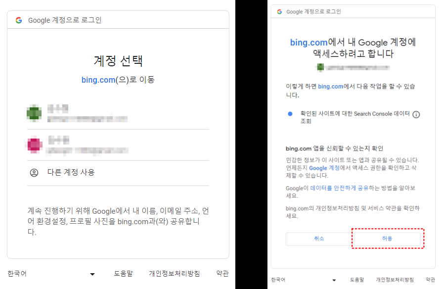 계정화면이 보이고 그중 하나를 클릭하면 bing.com에서 Google계정에 액세스 하려고 합니다라는 화면이 보입니다.