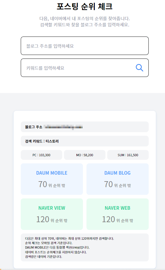 사용방법도 간단해서 블로그의 주소와 검색하고 싶은 키워드를 입력해 주면 다음과 네이버의 순위를 바로 확인할 수 있습니다.