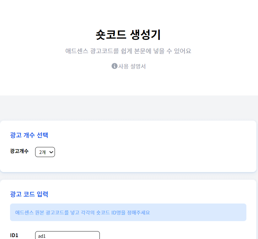 숏코드 생성기는 티스토리 블로그 작성 중 본문의 원하는 위치에 광고코드를 넣는 생성기입니다.